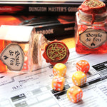 Nos sorts en flacon, entièrement faits main, sont le fruit d'une longue réflexion et de beaucoup d'essais pour en arriver à ce résultat. Au moment de lancer votre fireball, que vous reconnaîtrez à son étiquette désignée sur mesure, ôtez le bouchon en liège cacheté et doré à la main et faites rouler les dés contenus dans le flacon sur la table. Une fois le calcul des dégâts fait, vous pouvez remettre les dés en place et refermez le bouchon, maintenu par une ficelle intégrée dans la cire.