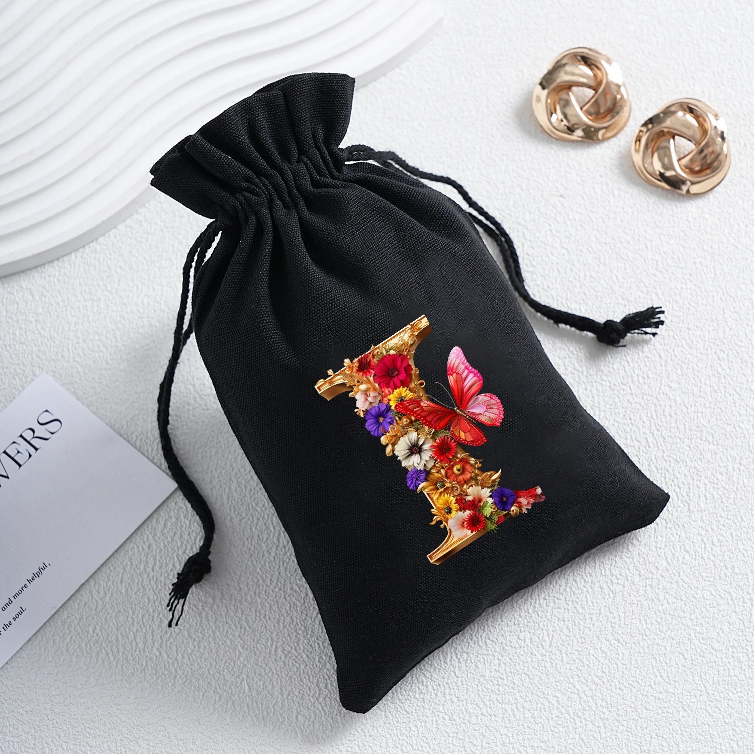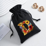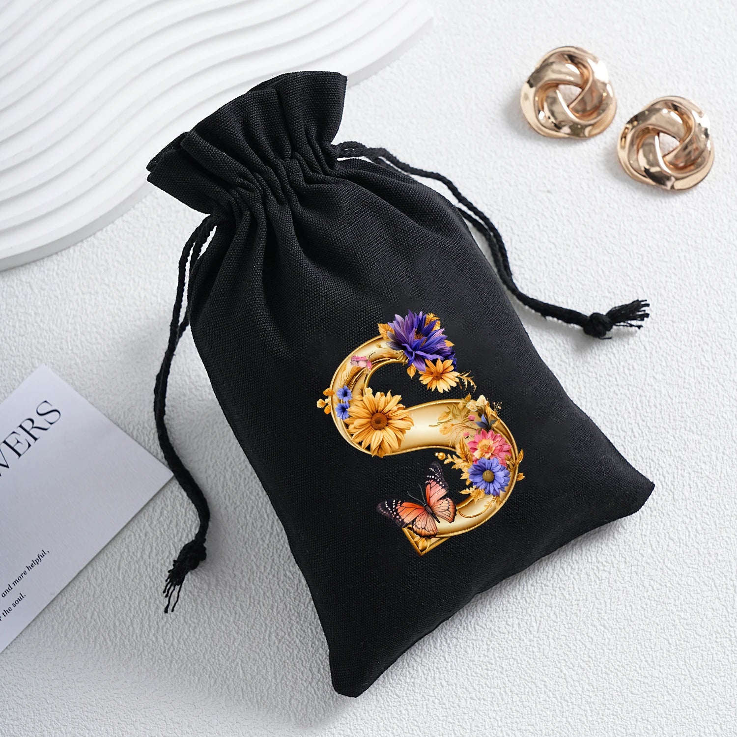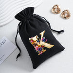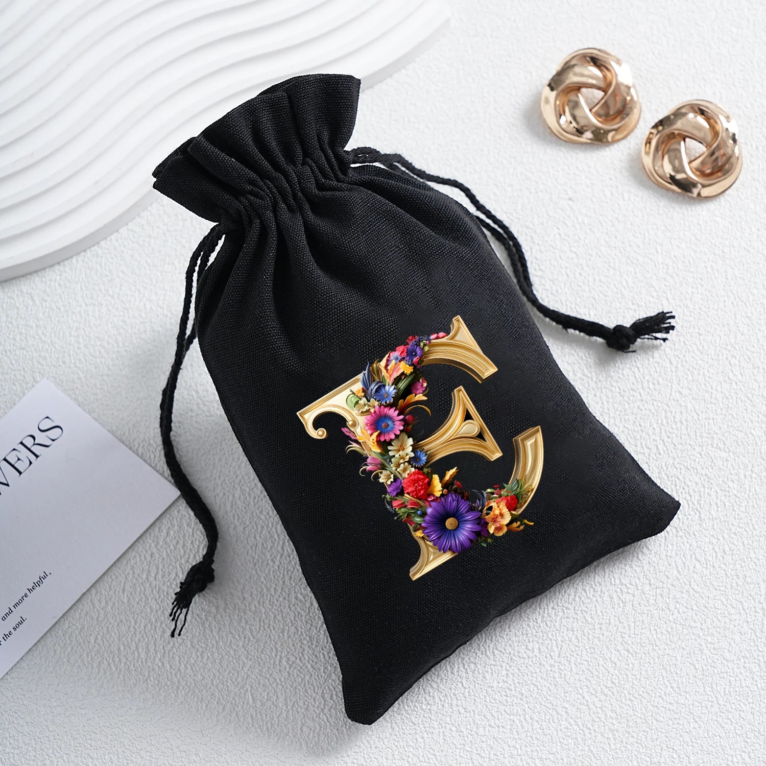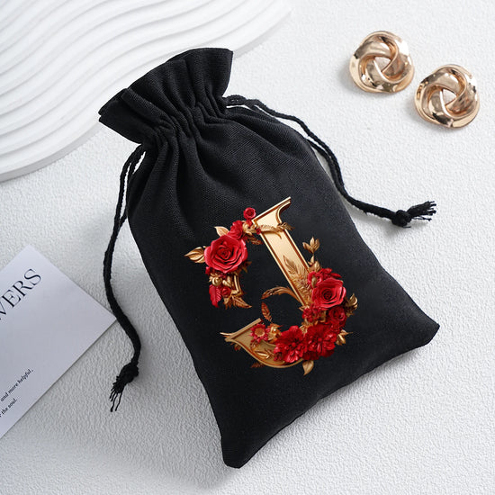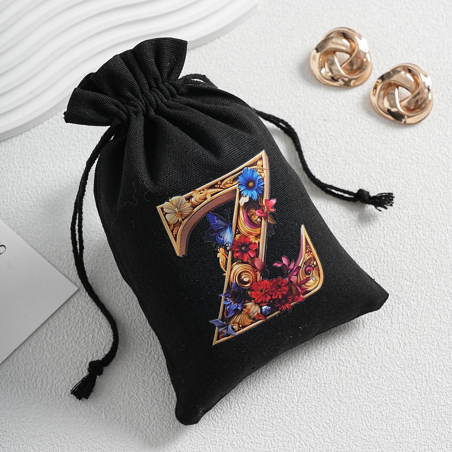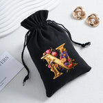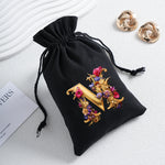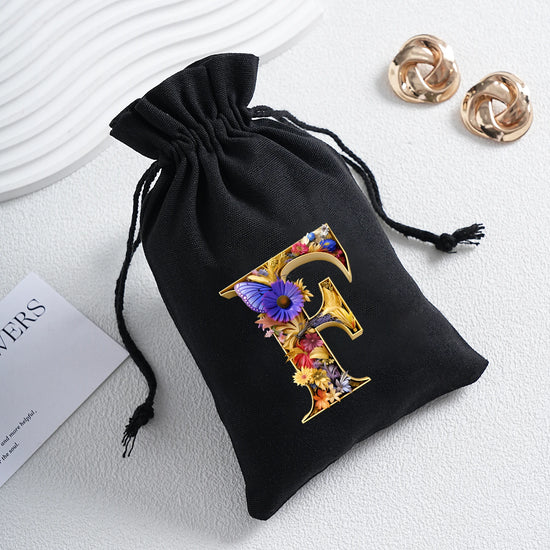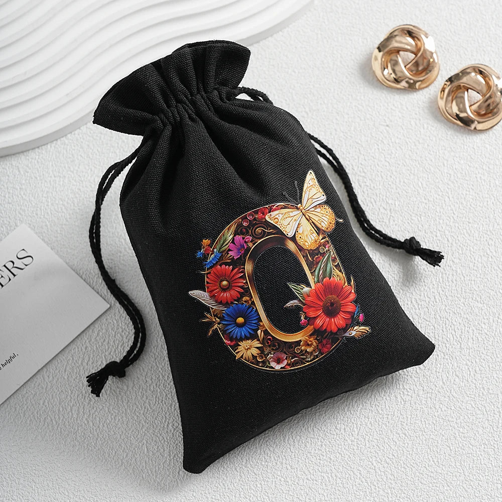 Bourse à dés personnalisable avec alphabet floral en transfert thermique, avec fermeture par cordon coulissant, idéale pour ranger et protéger vos dés de jeu de rôle avec style.