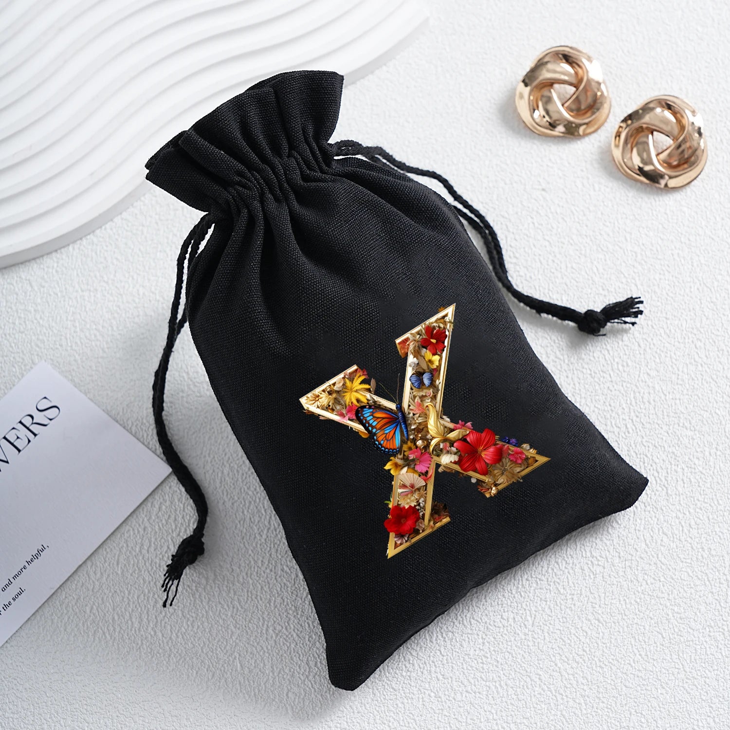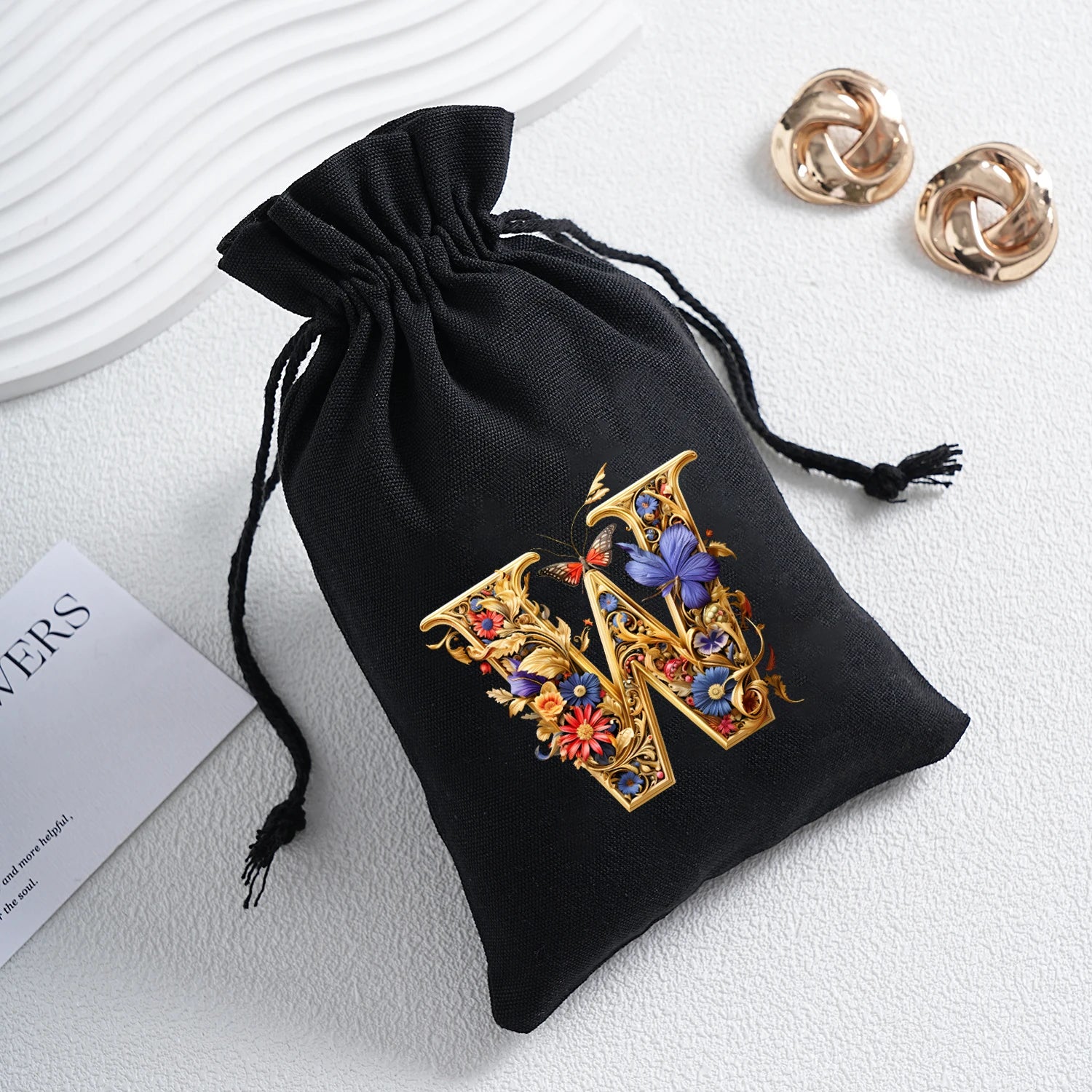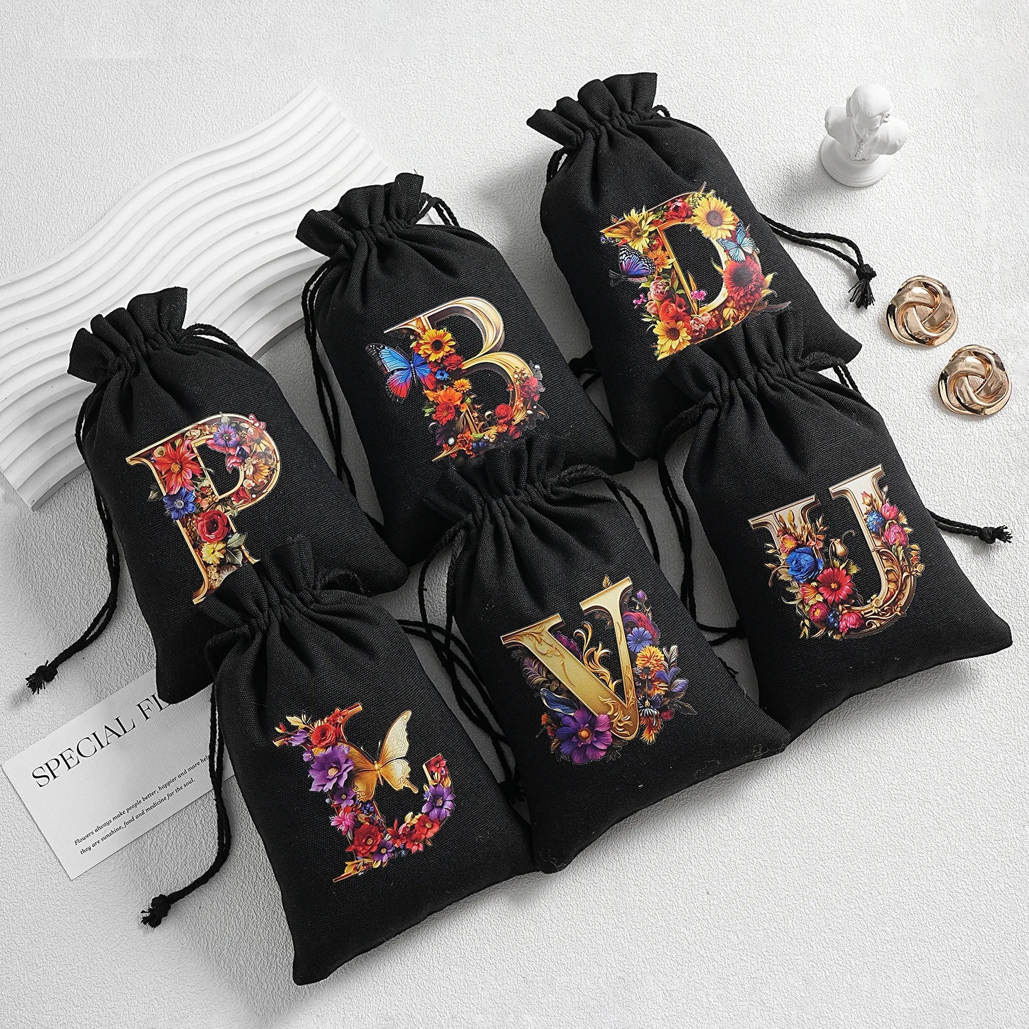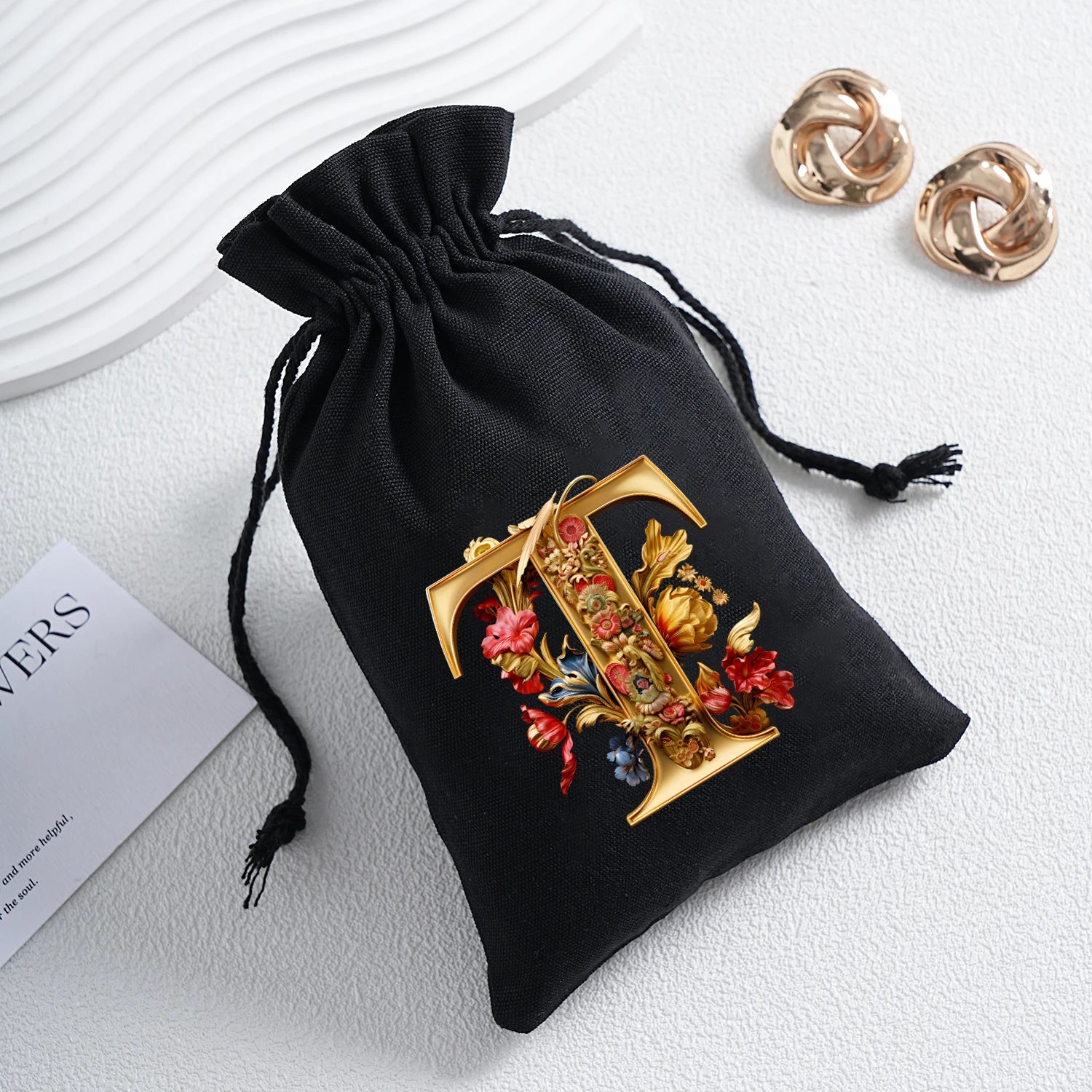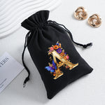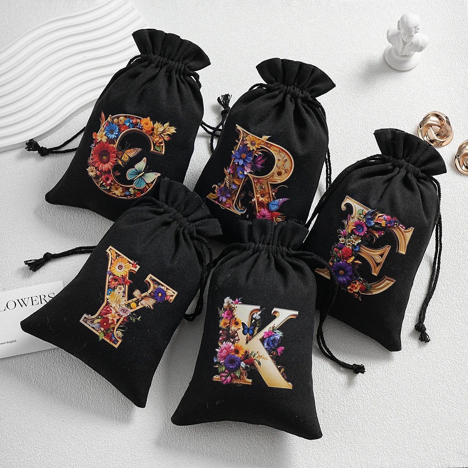 Bourse à dés personnalisable avec alphabet floral en transfert thermique, avec fermeture par cordon coulissant, idéale pour ranger et protéger vos dés de jeu de rôle avec style.