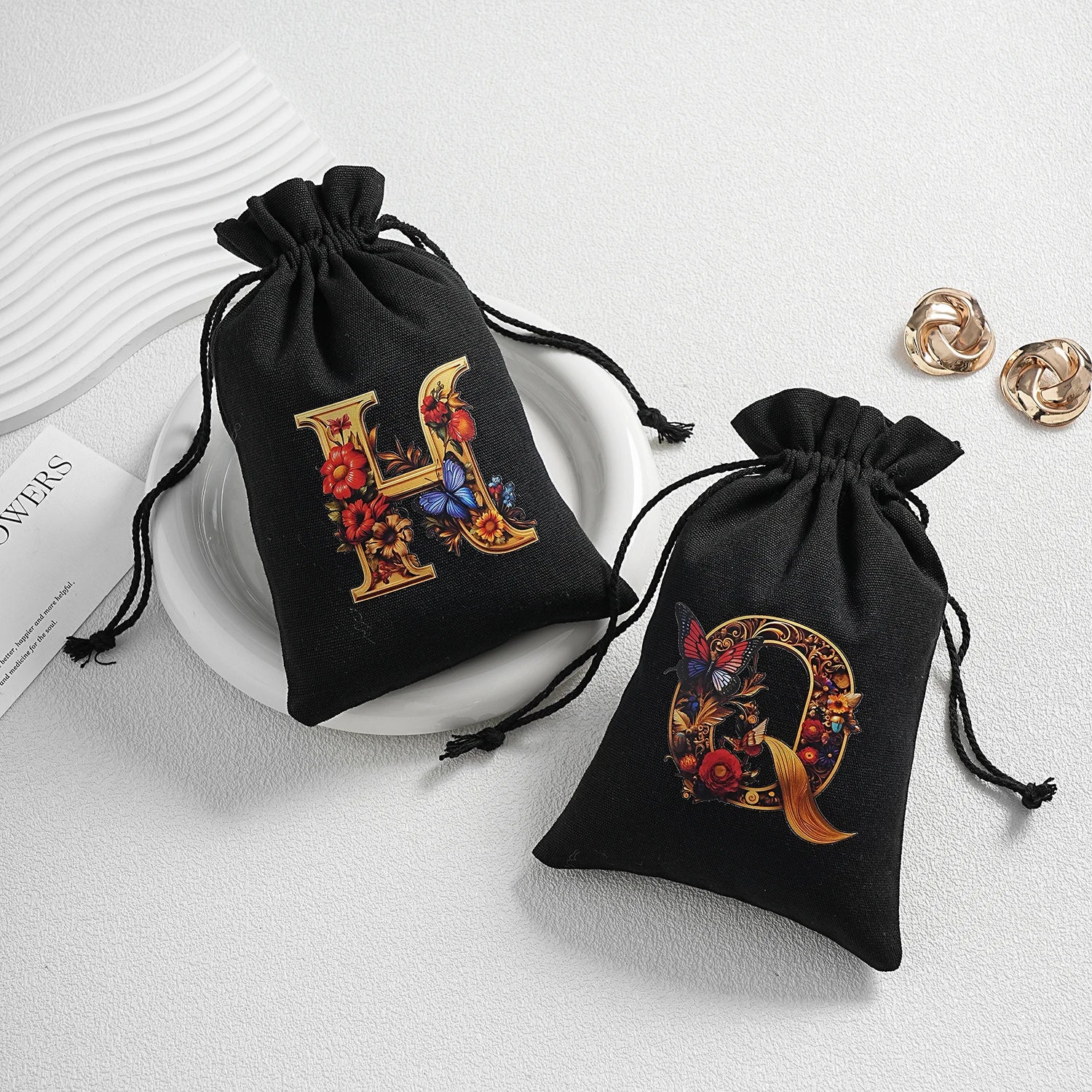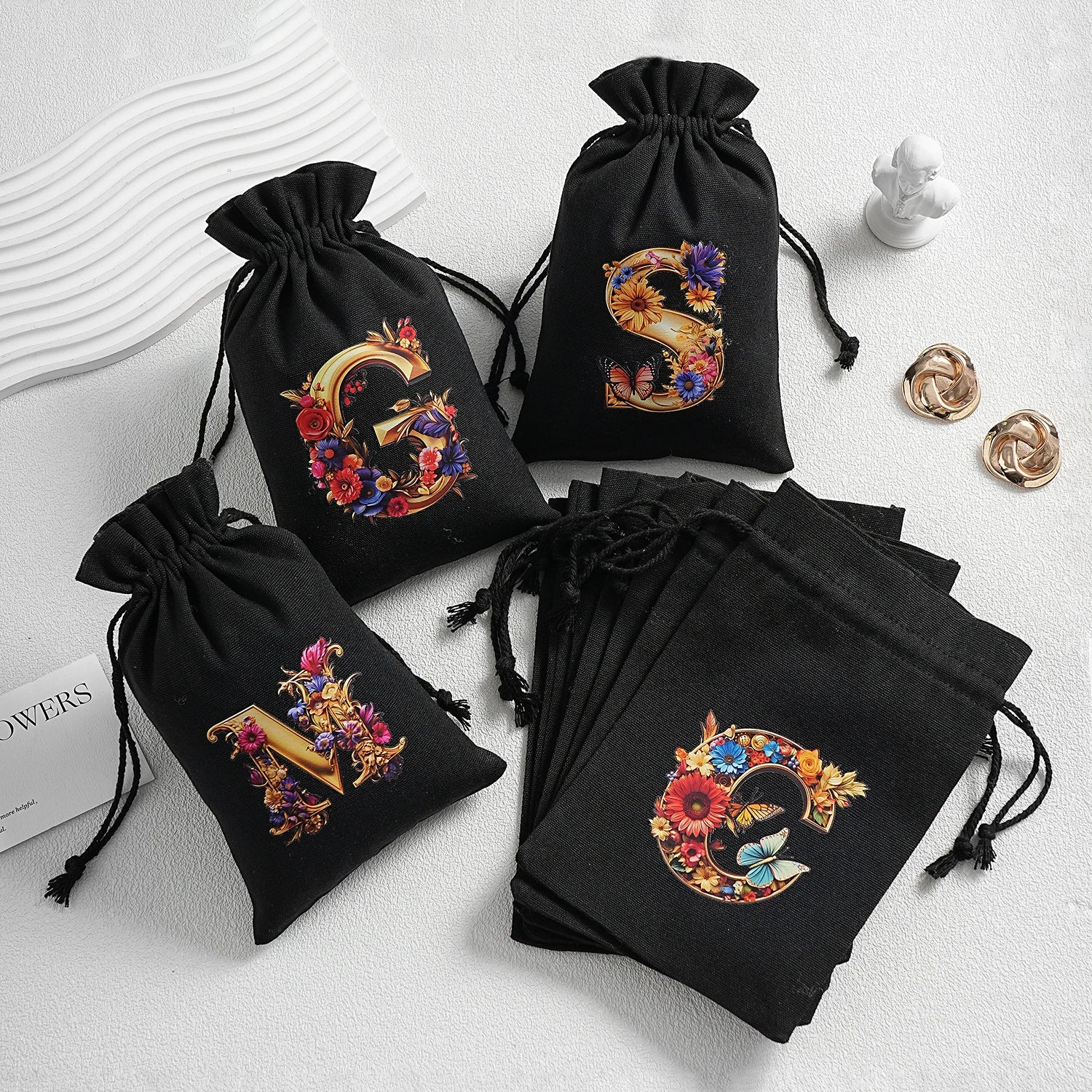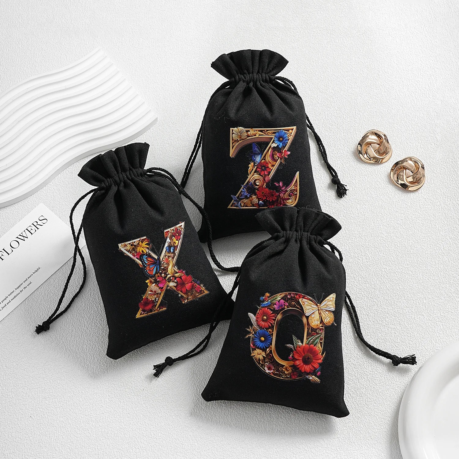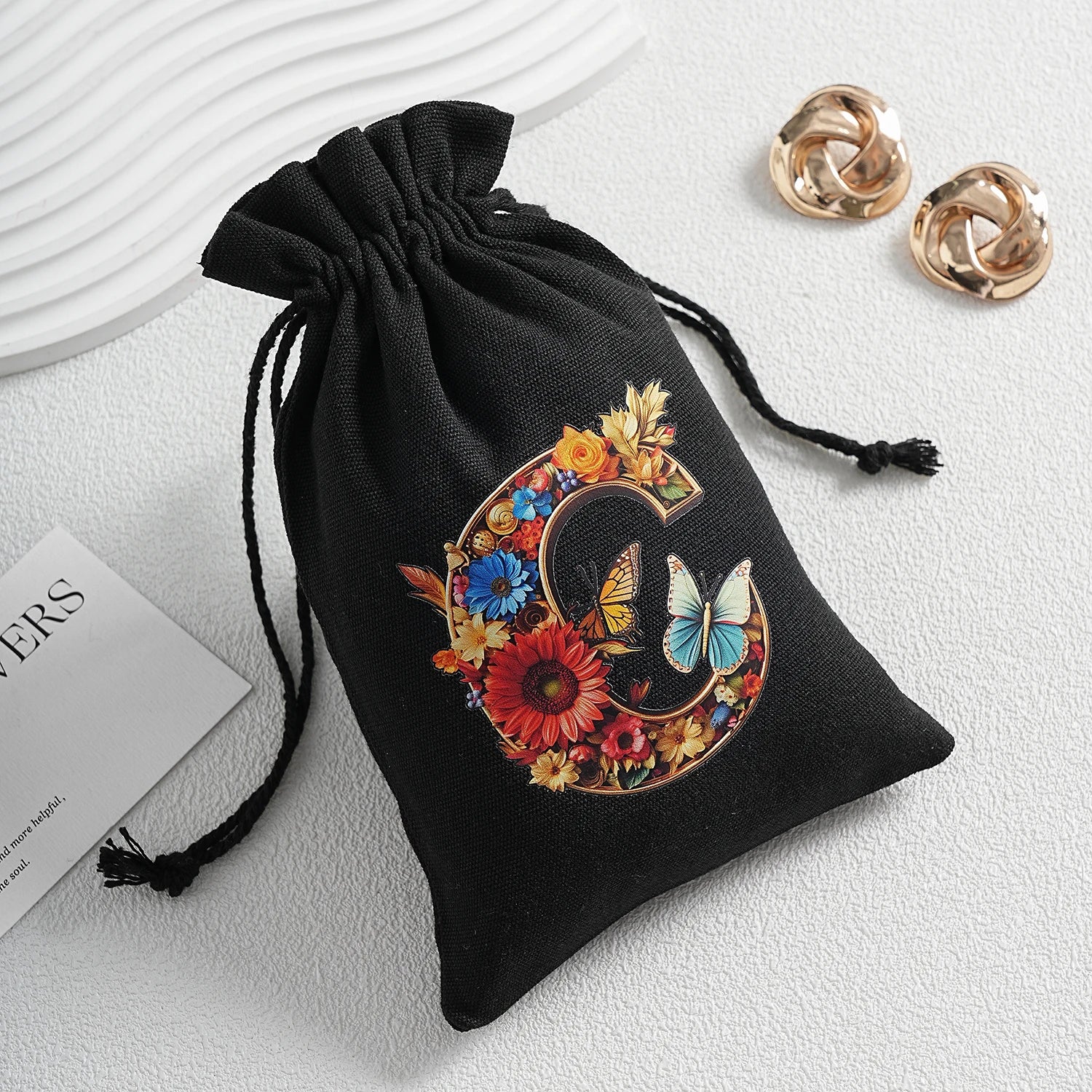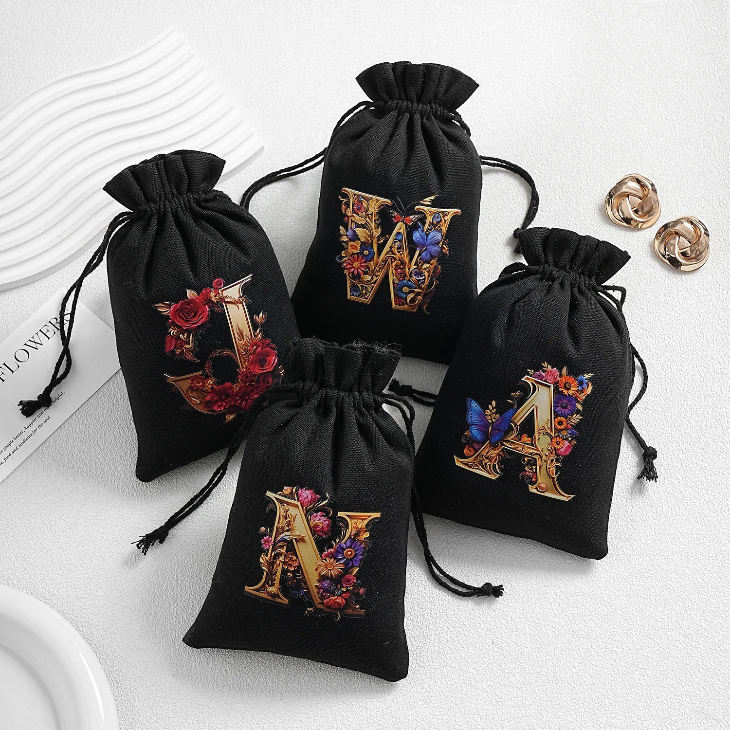 Bourse à dés personnalisable avec alphabet floral en transfert thermique, avec fermeture par cordon coulissant, idéale pour ranger et protéger vos dés de jeu de rôle avec style.