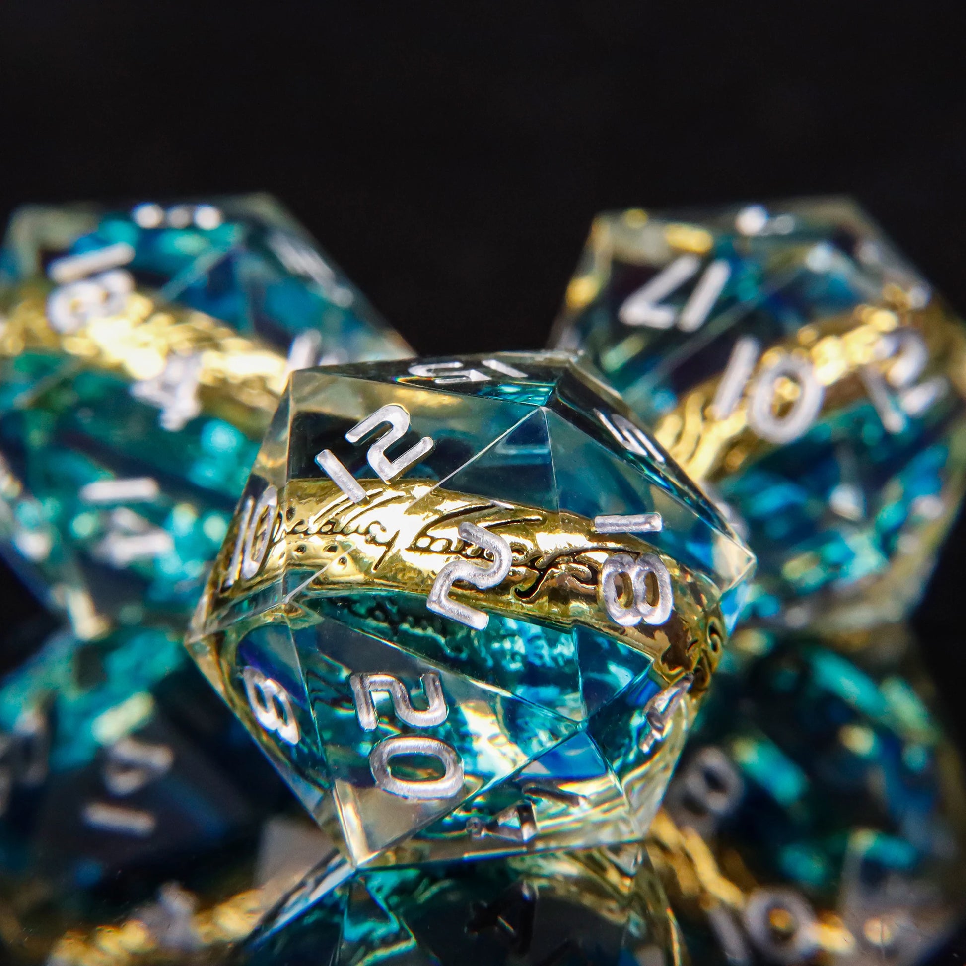 Inspiré directement du légendaire Seigneur des Anneaux, ce dé à 20 faces en résine intègre un anneau miniature dans sa structure translucide. Chaque pièce est unique, avec ses nuances de différentes couleurs et ses chiffres dorés parfaitement lisibles. La résine transparente permet d'admirer l'anneau suspendu au cœur du dé, créant un effet visuel saisissant à chaque lancer. Ce dé combine esthétique soignée et fonctionnalité pour vos parties de jeu de rôle.