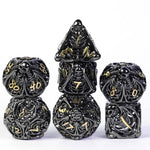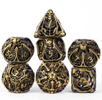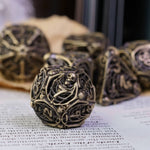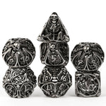 Set de dés de jeu de rôle en métal. Chaque face représente un squelette.