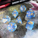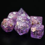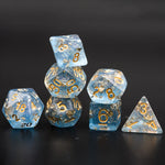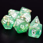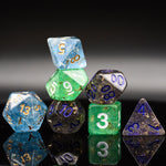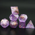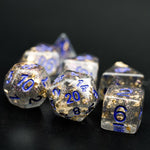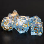 Cette collection de sets de dés de jeu de rôle en résine écologique transparente contiennent des feuilles d'or, leur donnant un aspect brillant et précieux.