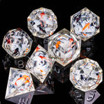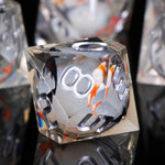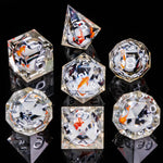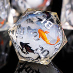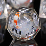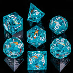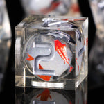 Avec le set de dés poisson, on met le cap sur l’immersion : transparences profondes, éclats nacrés et chiffres bien marqués qui se lisent d’un coup d’œil. La prise en main est agréable, les arêtes donnent un roulement franc, et le thème aquatique installe instantanément l’ambiance d’une cale, d’un récif ou d’une cité engloutie. Sur la table, chaque lancer évoque un remous, une vague, un souffle venu des profondeurs… et le d20 qui claque, c’est la houle qui décide du destin de l’équipage.