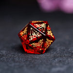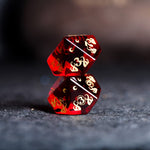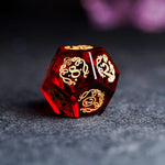Le Set de dés de JDR en Verre Rouge translucide - Cthulhu est réalisé avec un verre rouge sombre et translucide qui évoque les profondeurs inexplorées des océans et les ténèbres de l'inconnaissable.