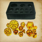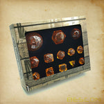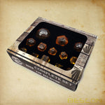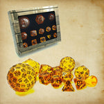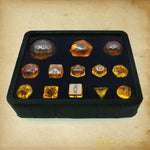 - Des dés translucides couleur ambre – Chaque dés est parfaitement lisible et leur couleur ambre en font des dés sublimes ;