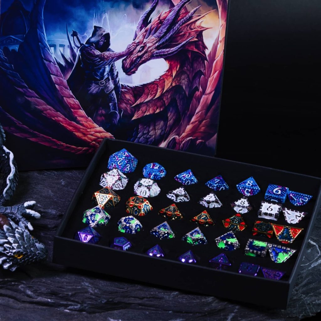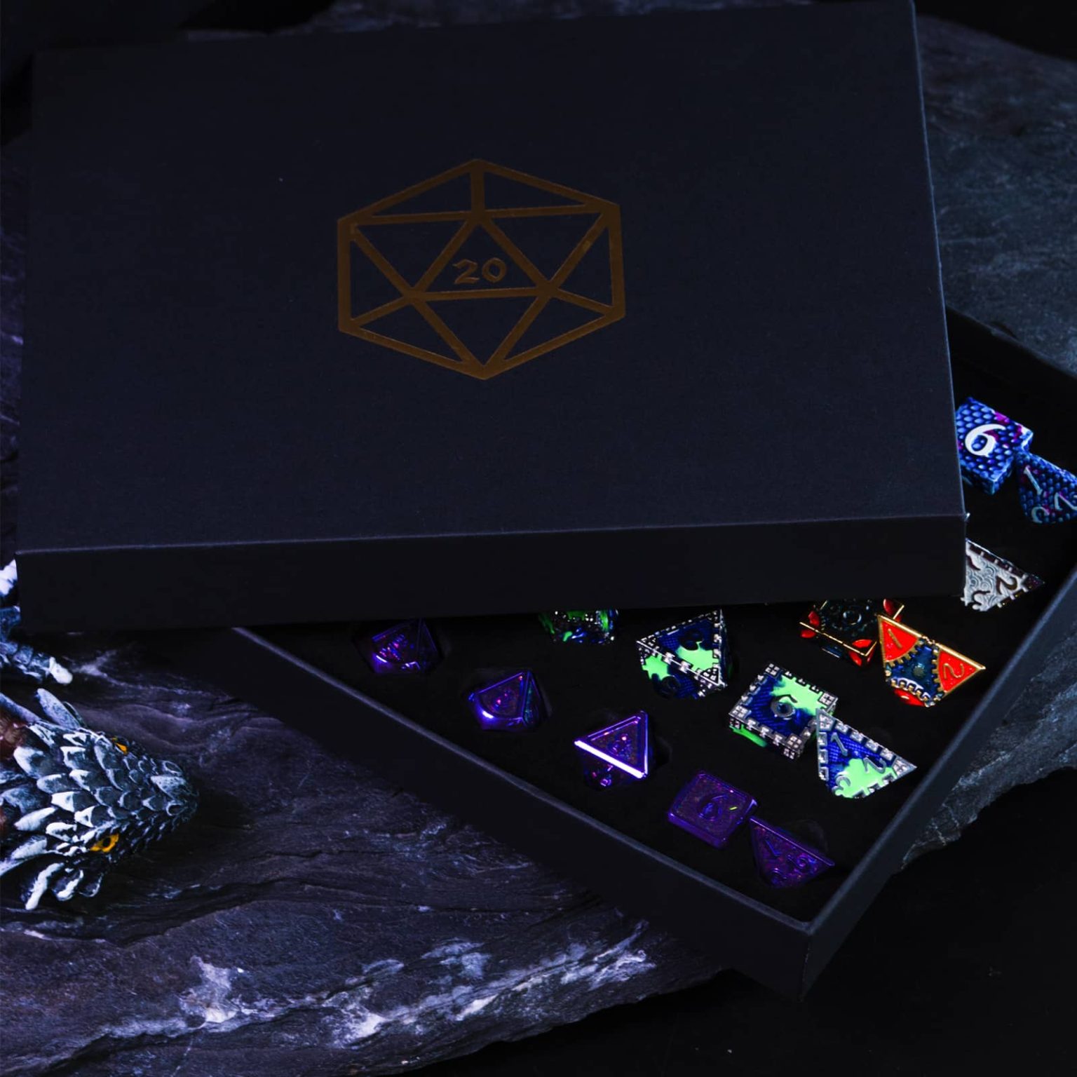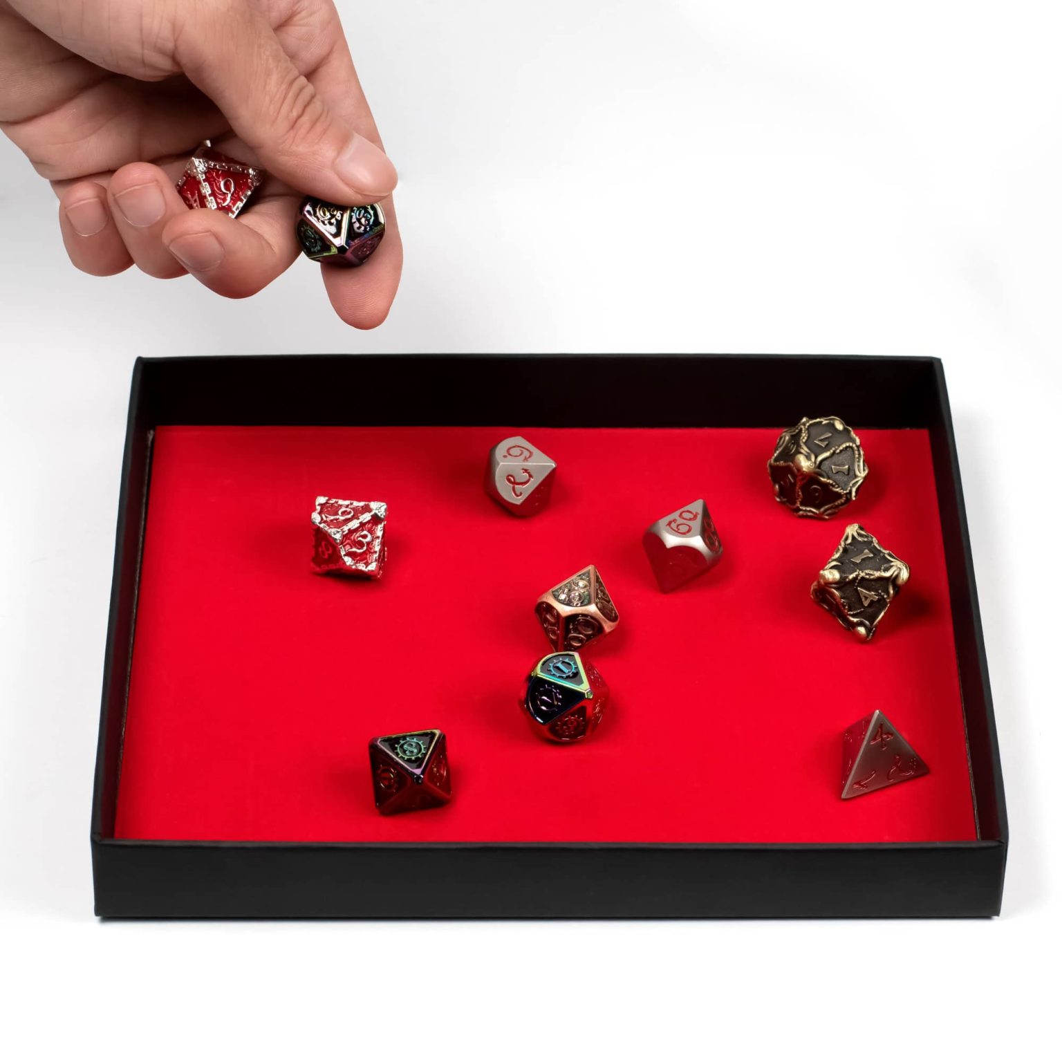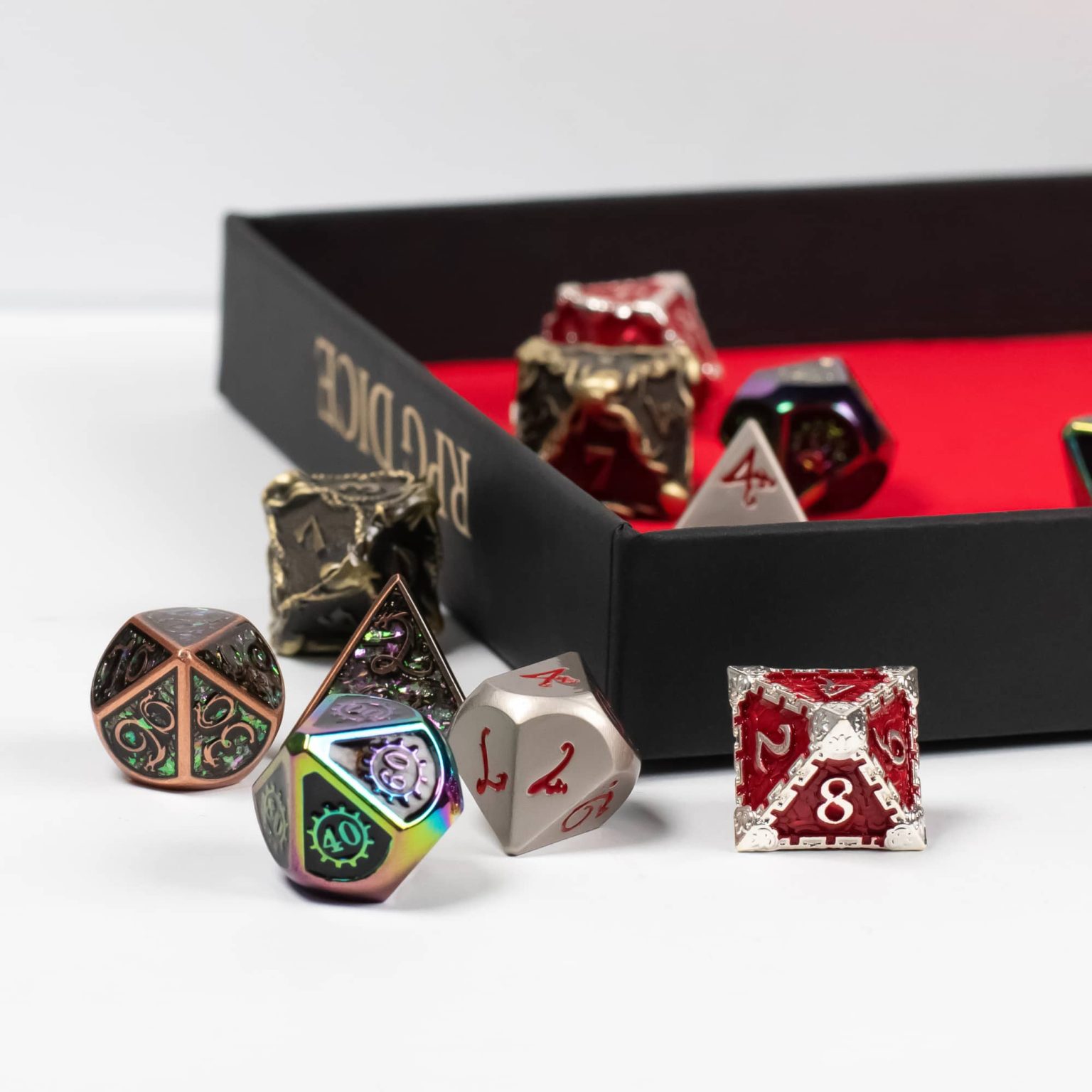 Boîte Cadeau de dés en Métal. Comprend 5 sets de dés en métal aléatoires, gravés avec précision et une piste à dés pour une expérience de jeu unique.