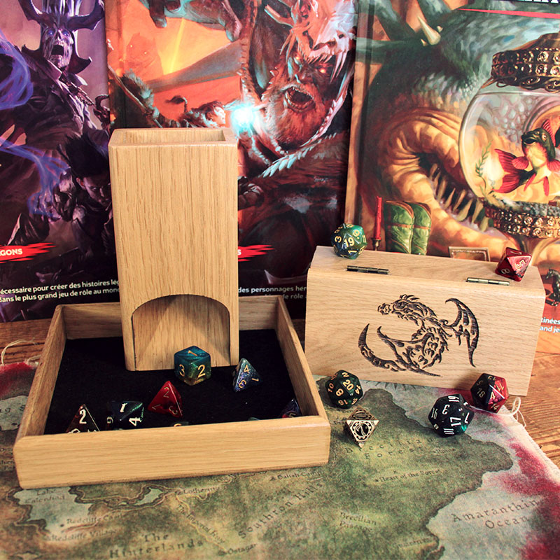 La tour à dés et la boite à dés sont tous les deux l’image d’un terrible dragon et d’un majestueux phénix, gravés au laser à même le bois. Ces deux créatures emblématiques veillent sur vos précieux dés et vous garantissent des lancers exceptionnels.