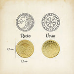 Avec ces pièces issues d’un trésor draconique ramené des hautes terres vikings, vous avez enfin du butin à mettre en avant sur votre table de jeu de rôle. La face de chaque pièce est frappée d’un symbole évocateur. Le recto représente une tête de dragon : la créature emblématique du plus grand jeu de rôle au monde, Donjons et Dragons. La verso représente un compas viking, ce symbole évocateur est une invitation à l’aventure.