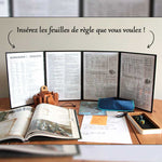 - Un écran grand format : Avec 4 panneaux pouvant accueillir des fiches A4, vous avez de quoi afficher un max de règles et masquer efficacement vos notes des regards indiscrets.
