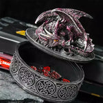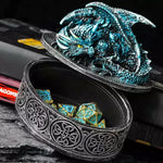 De forme ronde, votre rangement sert d'autel à un majestueux dragon rouge, dragon vert, ou dragon bleu, qui veille farouchement sur votre butin. Vous avez là l'accessoire parfait pour ranger vos trésors : bijoux, clefs, babioles, sans oublier bien sûr vos précieux dés de jeu de rôle. Vous pouvez même l'utiliser comme accessoire de décoration.