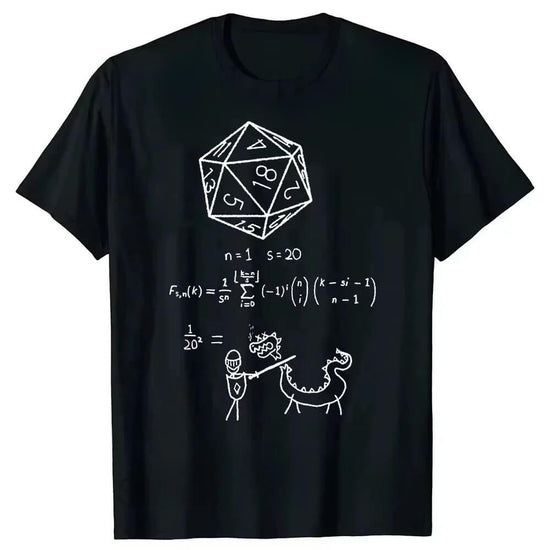 Ce tee-shirt "formule mathématique du D20" est le pont parfait entre science et imaginaire. Arborant un magnifique D20 en wireframe géométrique accompagné d'une formule mathématique de distribution de probabilités, ce vêtement transforme ta passion en démonstration scientifique. Le design minimaliste blanc sur fond noir crée un contraste saisissant qui attire immédiatement l'œil, tandis que la petite illustration humoristique en bas (montrant un personnage brandissant victorieusement son dé) ajoute une touche de légèreté bienvenue. Fabriqué en coton respirant de qualité, ce tee-shirt te permet de rester concentré sur tes calculs de dégâts même lors des sessions les plus intenses. Le tissu fin et léger évacue l'humidité, parfait pour ces moments où tu transpires en attendant le résultat crucial d'un jet de sauvegarde.