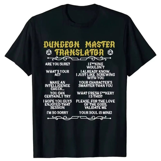 Ce tee-shirt "langage du maître de jeu" est LE guide de survie vestimentaire que tout rôliste devrait posséder. Avec son design rétro en style parchemin médiéval, il liste les expressions cultes des MJ et leur véritable signification : "Are you sure?" (tu vas mourir), "I'll allow it" (c'est débile mais amusant), "Make an intelligence check" (tes personnages sont plus intelligents que toi), et bien d'autres perles du folklore rôlistique. Fabriqué en coton confortable et respirant, ce vêtement te permet de survivre aux longues sessions où ton MJ multiplie les "roll for initiative" inattendus. Le tissu léger et les manches courtes en font le compagnon idéal pour ces soirées où la température monte à mesure que les pièges s'accumulent dans le donjon.