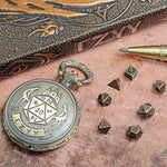 Vous cherchez à personnaliser votre pratique du jeu de rôle ? Notre montre à gousset en métal est un accessoire unique qui vous permet de jouer avec style. La face de la montre à gousset est frappée du D20, l'emblème du jeu de rôle, tandis que le dos est gravé de magnifiques symboles oniriques. Mais ce n'est pas tout - la montre renferme également un mini set de dés en métal, vous permettant de jouer n'importe où et n'importe quand.